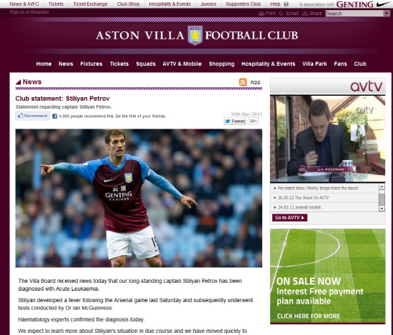 | 페트로프가 백혈병 판정을 받았다. 사진캡쳐=애스턴빌라 홈페이지 |