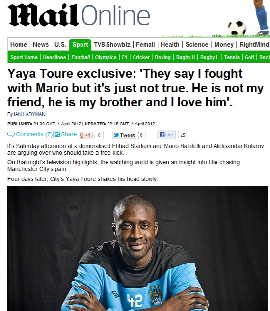 투레는 "많은 사람들이 내가 발로텔리와 스완지시티전, 선덜랜드전에서 싸웠다고 말한다. 충격적이었다. 내 변호사도 나를 불러 이에 대해 물어봤다. 당시 나는 처음들은 얘기였다"고 설명했다.