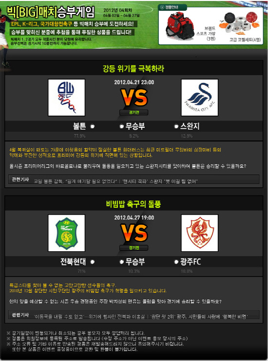 이번 4월의 빅매치 대상경기를 살펴보면 1경기는 21일 열리는 EPL 볼튼-스완지시티전이 선정됐다. 강등권을 전전하던 양 팀은 최근 달라진 모습이다. 미드필더 무암바가 경기 중 심장마비로 쓰러지며 충격에 휩싸였던 볼턴은 투지를 앞세워 승승장구하고 있다. 정규리그에서 3연승을 달리며 강등권에서 탈출했다. 짧은 패스로 공 점유율을 끌어올리는 경기방식으로 'EPL의 바르셀로나'로 불리는 스완지시티는 3월 12일 맨시티를 1대0으로 꺾으며 파란을 일으켰다. 패기로 뭉친 양 팀간 박빙의 승부가 펼쳐질 것으로 기대되고 있다.