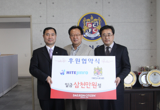 하이트진로가 대전 시티즌과 후원협약을 맺고 후원금을 전달하며, 대전 시티즌의 승리를 응원했다.