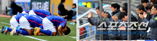 인천 최종환이 선제골을 성공시키자 선수들이 모두 모여 허정무 감독에게 큰절을 하고 있다.