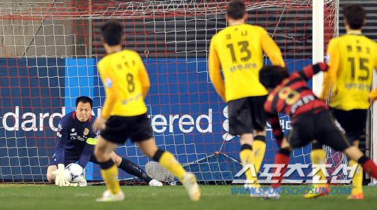 | 이운재 전남 골키퍼(왼쪽)가 상대 슈팅을 막아내고 있다. 포항=전준엽 기자 noodle@sportschosun.com |