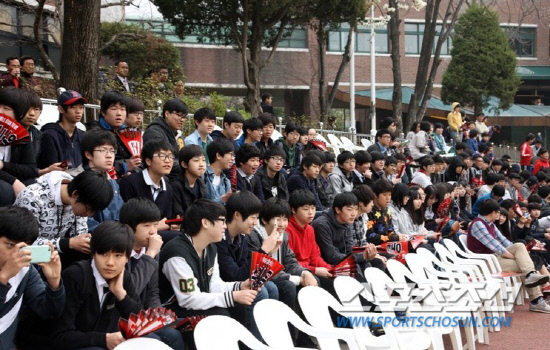 ◇여학생들이 그라운드에서 공을 차고 남학생들이 관전한다. 목청껏 뜨거운 응원전도 펼쳤다. 생경하지만 기분좋은 풍경이다.