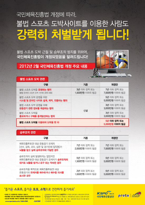 또 국무총리실산하의 사행산업통합감독위원회(www.ngcc.go.kr)에서 운영 중인 '불법사행행위 신고센터'를 통해 불법 체육 진흥투표권 발매 행위를 신고하면 신고 포상금 지급규칙에 의거 최고 100만원 까지 포상금이 지급된다.