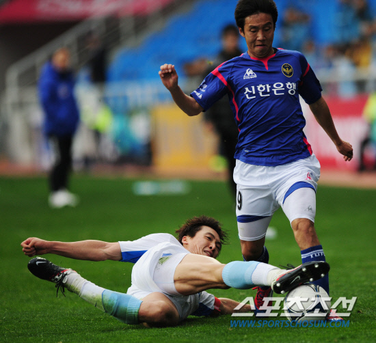 | ◇2012년 K-리그 초반부터 빈익빈 부익부 현상이 두드러지고 있다. 22일 인천축구전용구장에서 열린 리그 9라운드에서 울산 곽태휘(왼쪽)가 인천 박준태의 드리블을 태클로 저지하고 있다. 인천=정재근 기자 cjg@sportschosun.com |