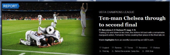 디디에 드로그바는 아직도 3년전 일을 있지 못한다. 사상 첫 빅이어를 위해 순항하던 첼시는 2008~2009시즌 유럽챔피언스리그 4강전에서 홈 2차전 종료직전 터진 이니에스타의 동점골로 탈락했다. 경기 중 나온 몇차례의 결정적 오심은 첼시 선수들을 흥분시켰다. 그 중에서도 유난히 분노를 표했던 드로그바였다. 드로그바는 당시 중계 카메라를 응시하며 분통을 터뜨려 징계까지 받았다. 바르셀로나를 상대로 이를 악문 드로그바는 와신상담에 성공했다.