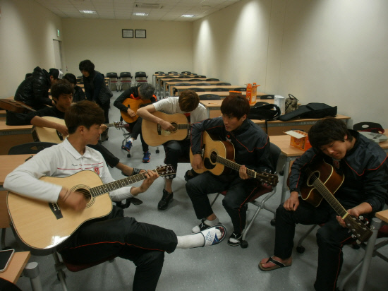 | 기타를 배우는 제주 선수단. 스포츠조선DB. |