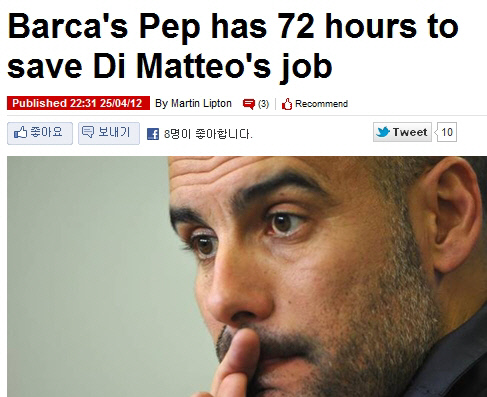 26일(한국시각) 영국 일간지 데일리미러는 호셉 과르디올라 바르셀로나 감독이 로베르토 디 마테오 첼시 임시감독의 거취에 중요한 열쇠를 쥐고 있다고 보도했다. 데일리미러에 따르면 과르디올라 감독은 산드로 로셀 회장에게 바르셀로나에 잔류할지 여부에 대해 72시간 내에 통보해주겠다고 말한 것으로 알려졌다. 바르셀로나는 과르디올라 감독이 팀을 떠날 것을 대비해 이미 프랑스의 로랑 블랑 감독과 접촉한 것으로 보인다. 만약 과르디올라 감독이 바르셀로나와 재계약을 하지 않는다면, 첼시가 행선지가 될 가능성이 높다. 로만 아브라모비치 구단주는 바르셀로나의 아름다운 축구를 만든 과르디올라 감독의 팬이다. 과거부터 그를 데려오고 싶다는 의지를 숨기지 않았다.
