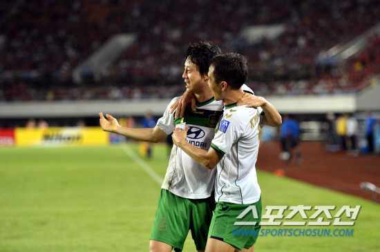 ◇전북이 IFFHS가 발표한 2012년 5월 세계클럽랭킹에서 63위를 기록해 아시아에서 가장 높은 순위를 기록했다. 지난 2일 광저우 톈허 스타디움에서 열린 광저우와의 아시아챔피언스리그 경기에서 득점에 성공한 전북 이승현이 환호하고 있다. 광저우(중국)=사진공동취재단