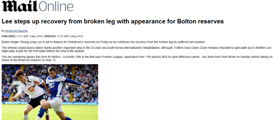 영국 일간지 데일리메일은 4일(한국시각) 오언 코일 감독의 발언을 인용해 '이청용이 볼턴 리저브팀 경기에 모습을 드러낼 것'이라고 전했다. 사진캡처=데일리메일 홈페이지