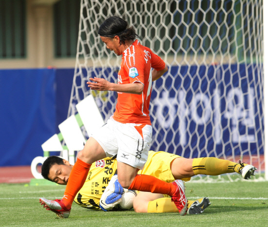 | ◇5일 오후 강릉종합운동장에서 열린 강원FC와 상주 상무 간의 2012년 K-리그 11라운드. 강원 시마다가 슈팅 찬스에서 상주 골키퍼 김호준의 선방에 막히고 있다. 사진제공=강원FC |