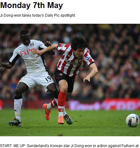 8일(한국시각)선덜랜드 구단 공식 홈페이지는 풀럼 원정에서 선발로 나선 지동원이 풀럼 수비수를 제치고 질주하는 사진을 '오늘의 포토'로 선정했다. '나를 선발로 세워줘(START ME UP)'라는 제하의 사진 아래 '선덜랜드의 '코리안 스타' 지동원이 풀럼전에서 마틴 오닐 감독 부임 이후 처음으로 선발출전했다'는 설명을 덧붙였다. 리그 종료를 2경기 남긴 시점에서 니클라스 벤트너, 프레이저 캠벨을 제치고 선발 엔트리에 이름을 올린 지동원에 대한 현지의 관심을 입증했다. 지난해 12월 5일 오닐 감독이 부임 직전 관중석에서 지켜본 울버햄턴 원정 이후 5개월만에 선발로 나섰다. 지난 4월9일 0대4로 완패한 에버턴전 후반 교체출전 이후 근 한달만의 출전이다.