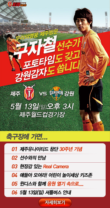 올해도 구자철은 다시 제주로 발걸음을 향한다. 최근 분데스리가에서의 활약으로 더 바쁜 몸이 됐지만 제주로 향하는 그의 마음은 즐겁기만 하다. 구자철은 13일 오후 3시 강원 FC와의 2012년 현대오일뱅크 K-리그 12라운드 홈경기가 열리는 제주월드컵경기장을 방문할 예정이다. 형식적인 관전이 아니다. 그는 오늘의 선수로 나서 팬들과의 만남은 물론 강원전 흥행몰이도 도울 계획이다.