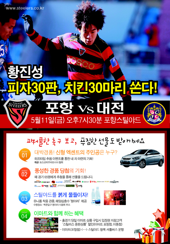 대전과의 홈경기 당일 스틸야드에는 황진성이 준비한 선물 이외에도 다양한 선물과 혜택이 팬들을 기다리고 있다. K-리그 포항 홈 경기마다 제공되는 신형 엑센트 경품을 포함해 식사교환권, 영화 관람권 등 팬들을 위한 푸짐한 경품도 준비되어 있다.