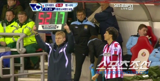 | 지난 1월 2일 맨시티전에서 후반 33분 벤트너와 교체 투입되고 있는 지동원. 화면 캡처=SBS ESPN |