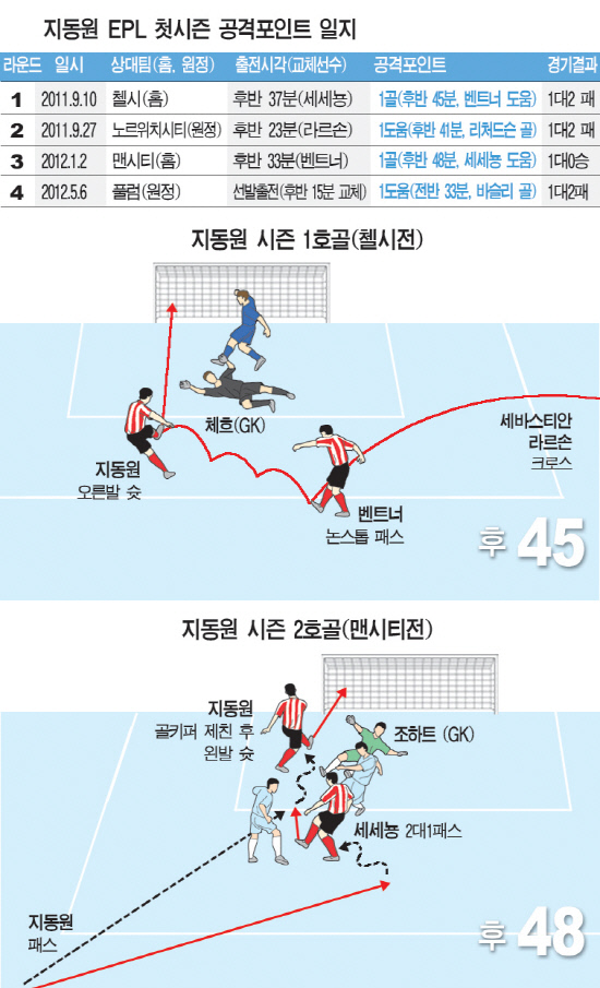 13일 밤(한국시각) 선덜랜드 홈구장인 스타디움 오브 라이트에서 열린 맨유와의 잉글랜드 프리미어리그(EPL) 38라운드 최종전에는 끝내 그라운드에 나서지 못했다. 맨유-맨시티의 불꽃 튀는 우승 다툼 속에 '코리안리거' 박지성-지동원 맞대결은 불발됐다. 리그 19경기 2골2도움으로 첫번째 시즌을 마감했다. '선덜랜드 공격수' 지동원의 올 시즌 활약상을 정리했다.