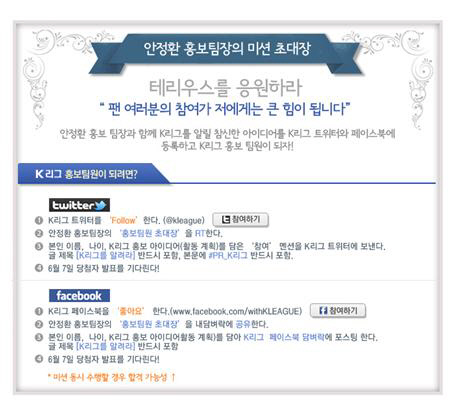 트위터와 페이스북 개인 계정 보유자는 남녀노소 누구나 지원 가능하다. K-리그 페이스북(www.facebook.com/withKLEAGUE)과 트위터(www.twitter.com/kleague)를 통해 30일까지 모집한다. 안정환 미션 초대장을 RT하거나 공유한 뒤 자신의 이름, 나이, 활동 계획 등을 담아 SNS로 전송하면 된다. 선발된 인원은 안정환이 부과하는 미션 수행을 통해 다양한 홍보활동에 참여하게 된다. 홍보팀원 발표는 7일 페이스북을 통해 이뤄진다. 김성원 기자 newsme@sportschosun.com