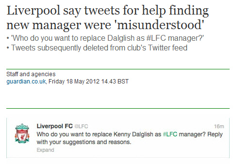 영국 일간지 가디언은 19일(한국시각) '리버풀이 공식 트위터를 통해 팬들에게 선호하는 새 감독 후보를 물었다가 망신을 당했다'고 전했다. 리버풀 트위터 관리자는 18일 '케니 달글리시 감독의 뒤를 이를 차기 감독 후보로 누구를 원하는가, 원하는 인물을 추천하고 이유를 설명해달라(Who do you want to replace Kenny Dalglish as LFC manager? Reply with your suggestions and reasons)'는 트윗을 남겼다. 이 글이 삽시간에 퍼져나가자 리버풀 구단 측은 "팬들의 의견을 알고 싶었을 뿐"이라면서 해당 글을 삭제했다. 그러나 팬들은 '최근 차기 감독 후보자들에게 퇴짜를 맞더니 갈피를 못 잡는 것 같다'며 한심하다는 댓글을 남겼다. 리버풀은 최근 로베르토 마르티네스(위건), 브랜든 로저스(스완지), 위르겐 클롭(도르트문트) 등과 접촉했으나, 협상에 실패하면서 체면을 구겼다.