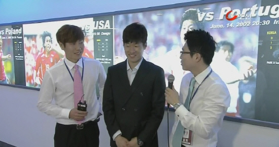 박지성은 이날 경기를 생중계한 TV조선에서 해설자로 깜짝 데뷔하기도 했다. 송종국 해설위원(왼쪽)과 함께 경기전 인터뷰를 하고 있는 박지성 사진=TV조선 방송화면