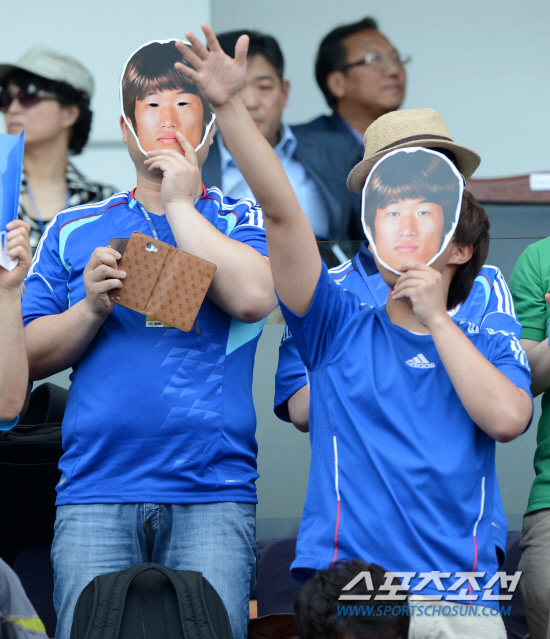 이날 수원월드컵경기장에는 3만7915명의 관중들이 몰려들어 '박지성 파워'를 실감케 했다. 박지성의 가면을 쓴 팬들이 환호하고 있다. 수원=허상욱 기자 wook@sportschosun.com