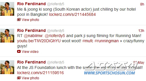 퍼디낸드는 이밖에도 박지성 정대세와 함께 점심식사를 하며 찍은 사진, 박지성과 함께 SBS 예능프로그램 '런닝맨' 녹화 동영상 등 을 통해 자선축구에 참가한 즐거움과 각별한 친분을 과시했다.