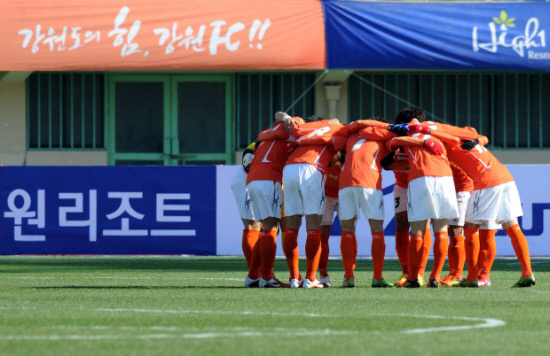 | ◇강원FC는 지역 최대 축제인 '농상전'을 위해 FA컵 16강 홈 경기 개최권을 반납하는 결정을 내렸다. 강원FC 선수들이 경기 전 파이팅을 외치고 있다. 사진제공=강원FC |