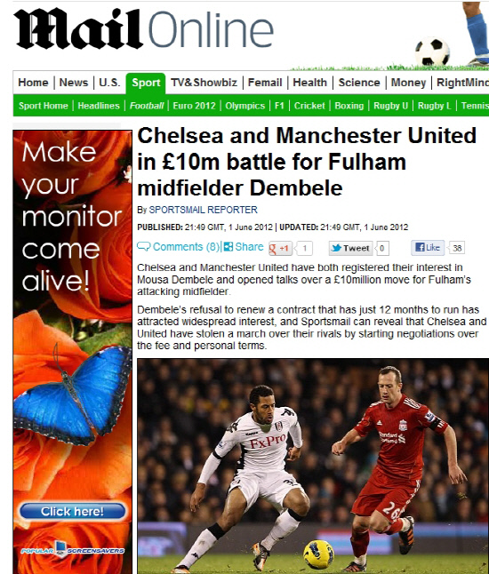 첼시와 맨유가 풀럼의 공격형 미드필더 무사 뎀벨레(24) 영입 전쟁을 펼치게 됐다.