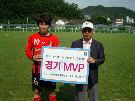김해시청 미드필더 방정록이 경기 MVP에 선정돼 기념 촬영을 하고 있다.사진제공=한국실업축구연맹
