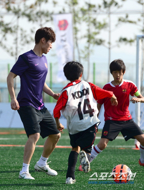 지난달 25일 수원시 영통구에 위치한 박지성축구센터에서 열린 '제2회 LG생활건강 JS컵 유소년 축구대회' 클리닉에서 대회에 참석한 유소년 선수들과 함께 미니게임을 펼치고 있는 박지성. 수원=송정헌 기자 songs@sportschosum.com