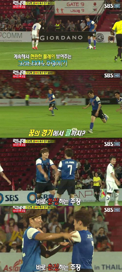 특히 후반부 안정환 선수와 교체 투입된 김종국은 현란한 발 솜씨와 숙련된 테크닉으로 두 명의 선수를 제쳐 박지성의 감탄을 자아냈다.