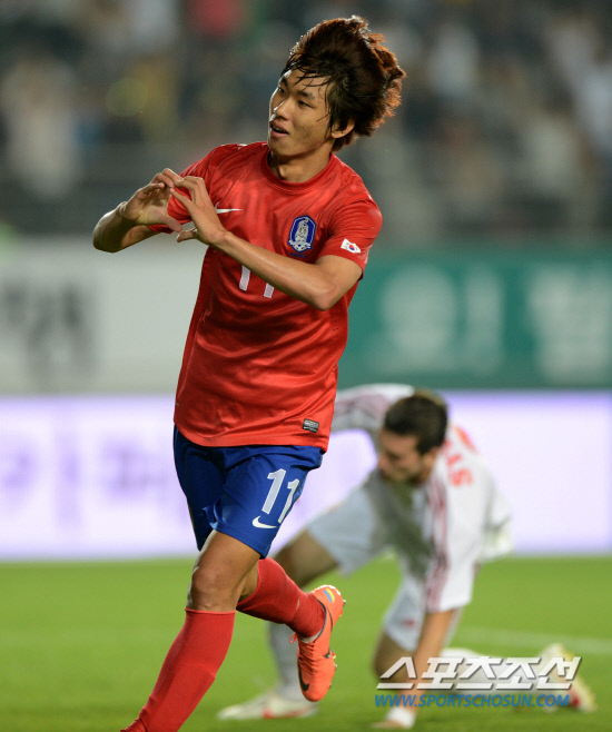7일 화성종합경기타운에서 펼쳐진 시리아와의 평가전, 전반 45분 문전에 선 윤일록(20·경남)의 움직임은 필사적이었다. 페널티박스 앞에서 흐른 볼을 놓치지 않고 후방의 윤빛가람에게 연결했다. 아크 정면에서 윤빛가람이 노려찬 슈팅이 시리아 골키퍼의 손을 맞고 튕겨나오자마자 윤일록이 질풍처럼 쇄도했다. 끝내 골맛을 봤다. 팀의 2번째 골을 터뜨린 후 관중석을 향해 뜨거운 하트를 날렸다.