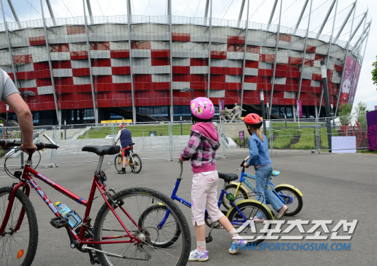 유로 2012 개막을 하루 앞둔 8일(한국시각) 폴란드 바르샤바의 축구 열기가 정점을 향해 달아오르고 있다. 바르샤바 국립경기장을 찾은 어린 소녀들이 경기장의 웅장한 위용에 발길을 멈추고 있다.