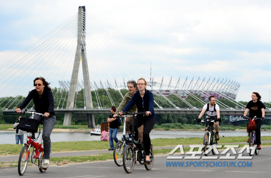 유로 2012 개막을 하루 앞둔 8일(한국시각) 폴란드 바르샤바의 축구 열기가 정점을 향해 달아오르고 있다. 하지만 폴란드 시민들은 여느때처럼 평온한 일상을 즐기고 있었다. 바르샤바 국립경기장이 보이는 비스와 강변에서 시민들이 자전거를 타며 평온한 오후를 즐기고 있다.