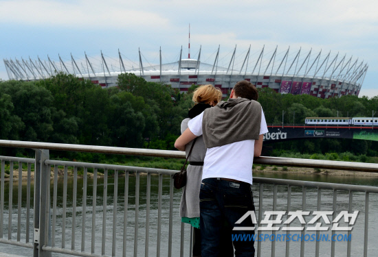 유로 2012 개막을 하루 앞둔 8일(한국시각) 폴란드 바르샤바의 축구 열기가 정점을 향해 달아오르고 있다. 하지만 폴란드 시민들은 여느때처럼 평온한 일상을 즐기고 있었다. 바르샤바 국립경기장이 보이는 비스와 강 다리위에서 한 쌍의 연인이 사랑을 속삭이고 있다.
