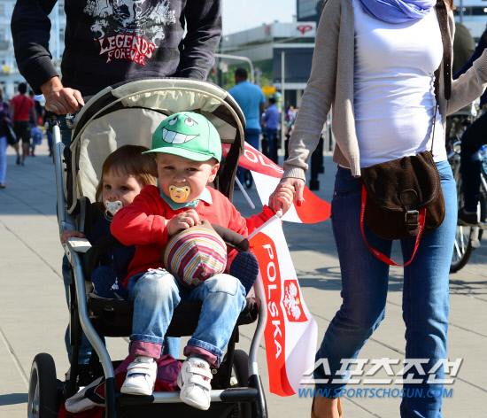 유로 2012 개막을 하루 앞둔 8일(한국시각) 폴란드 바르샤바는 축구 열기가 정점을 향해 달아오르고 있다. 폴란드 국기로 장식된 유모차에 아기 남매가 타고 있다.