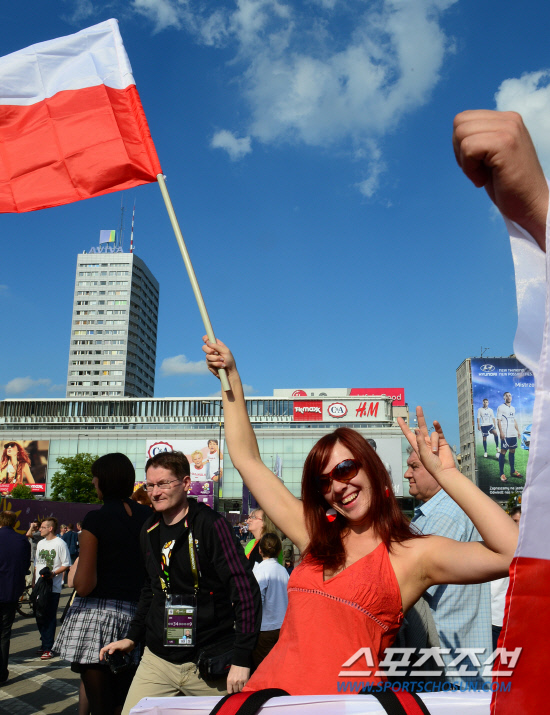 유로 2012 개막을 하루 앞둔 8일(한국시각) 폴란드 바르샤바는 축구 열기가 정점을 향해 달아오르고 있다. 바르샤바 문화과학궁전 앞 광장에서 열린 전야제에서 응원도구를 파는 미녀 상인이 폴란드 국기를 흔들며 즐거워하고 있다.