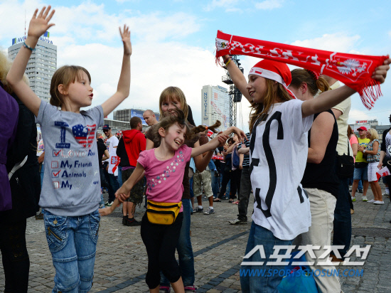 유로 2012 개막을 하루 앞둔 8일(한국시각) 폴란드 바르샤바는 축구 열기가 정점을 향해 달아오르고 있다. 바르샤바 문화과학궁전 앞 광장에서 열린 전야제에 모인 어린 소녀들이 음악에 맞춰 춤을 추고 있다.