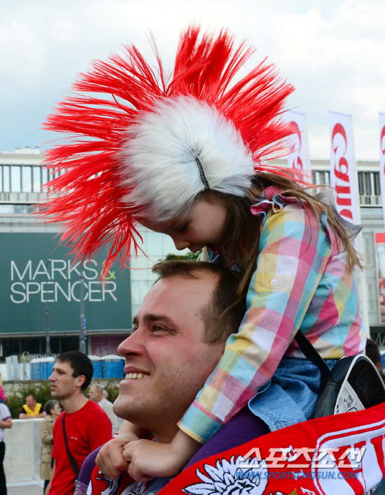 유로 2012 개막을 하루 앞둔 8일(한국시각) 폴란드 바르샤바는 축구 열기가 정점을 향해 달아오르고 있다. 바르샤바 문화과학궁전 앞 광장에서 열린 전야제에서 멋진 장식모자를 쓴 소녀가 아빠의 무등을 타고 즐거워하고 있다.