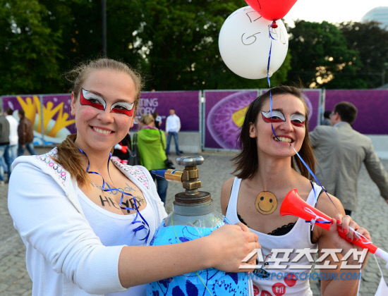 유로 2012 개막을 하루 앞둔 8일(한국시각) 폴란드 바르샤바는 축구 열기가 정점을 향해 달아오르고 있다. 바르샤바 문화과학궁전 앞 광장에서 열린 전야제에서 페이스페인팅을 한 여성들이 헬륨가스가 든 풍선을 팔고 있다.