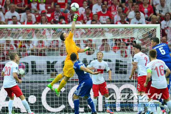 9일(한국시각) 폴란드 바르샤바 국립경기장에서 유로 2012 개막전 폴란드와 그리스의 경기가 열렸다. 폴란드 골키퍼 슈체즈니가 강력한 펀칭으로 공을 걷어내고 있다.