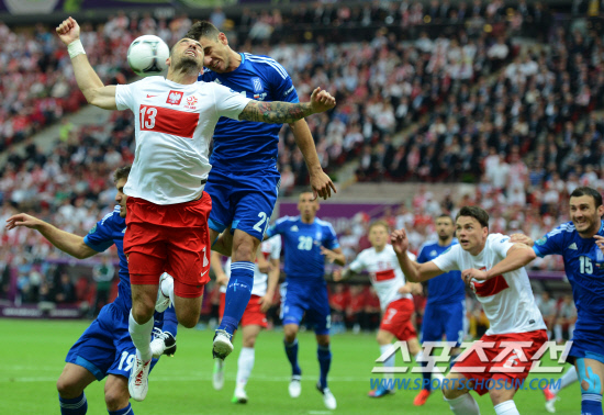 9일(한국시각) 폴란드 바르샤바 국립경기장에서 유로 2012 개막전 폴란드와 그리스의 경기가 열렸다. 폴란드 바실레프스키와 그리스 카추라니스가 그리스 문전에서 치열한 공중볼 다툼을 벌이고 있다.