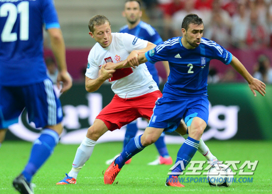 폴란드가 개막전에서 선제골을 넣고도 1대1 무승부에 그치고 말았다. 9일(한국시각) 폴란드 바르샤바 국립경기장에서 유로 2012 개막전 폴란드와 그리스의 경기가 열렸다. 폴란드는 전반 레반도프스키가 헤딩슛으로 선제골을 넣었지만 후반 그리스 살핑기디스에게 동점골을 허용했다. 폴란드 무라프스키가 그리스 마니아티스의 팔을 잡으며 드리블을 저지하고 있다.