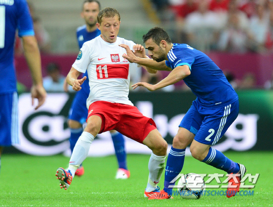 폴란드가 개막전에서 선제골을 넣고도 1대1 무승부에 그치고 말았다. 9일(한국시각) 폴란드 바르샤바 국립경기장에서 유로 2012 개막전 폴란드와 그리스의 경기가 열렸다. 폴란드는 전반 레반도프스키가 헤딩슛으로 선제골을 넣었지만 후반 그리스 살핑기디스에게 동점골을 허용했다. 폴란드 무라프스키와 그리스 마니아티스가 공을 다투고 있다.