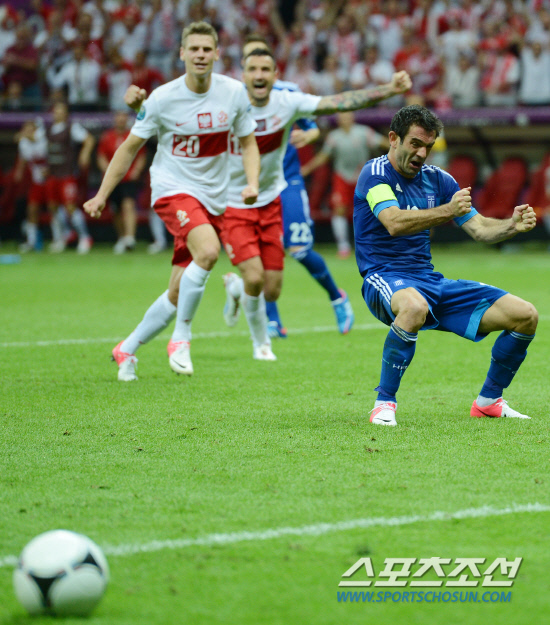 9일(한국시각) 폴란드 바르샤바 국립경기장에서 유로 2012 개막전 폴란드와 그리스의 경기가 열렸다. 후반 1-1 동점상황에서 패널티킥을 얻은 그리스의 카라구니스가 실축을 한 후 괴로워하고 있다. 반면 기사회생한 폴란드 선수들은 환호하고 있다.