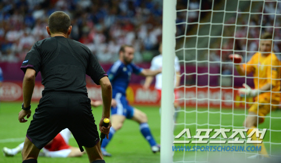 9일(한국시각) 폴란드 바르샤바 국립경기장에서 유로 2012 개막전 폴란드와 그리스의 경기가 열렸다. 양팀이 치열한 접전을 벌이는 가운데 골대 옆 엔드라인에서 심판이 경기를 주시하고 있다. 이번 대회에서는 주심과 선심 두명, 양쪽 엔드라인에 2명의 심판이 배치돼 더 정확한 판정을 기하고 있다.