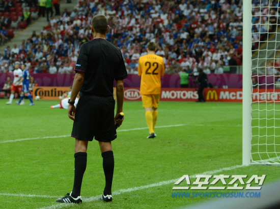 9일(한국시각) 폴란드 바르샤바 국립경기장에서 유로 2012 개막전 폴란드와 그리스의 경기가 열렸다. 양팀이 치열한 접전을 벌이는 가운데 골대 옆 엔드라인에서 심판이 경기를 주시하고 있다. 이번 대회에서는 주심과 선심 두명, 양쪽 엔드라인에 2명의 심판이 배치돼 더 정확한 판정을 기하고 있다.