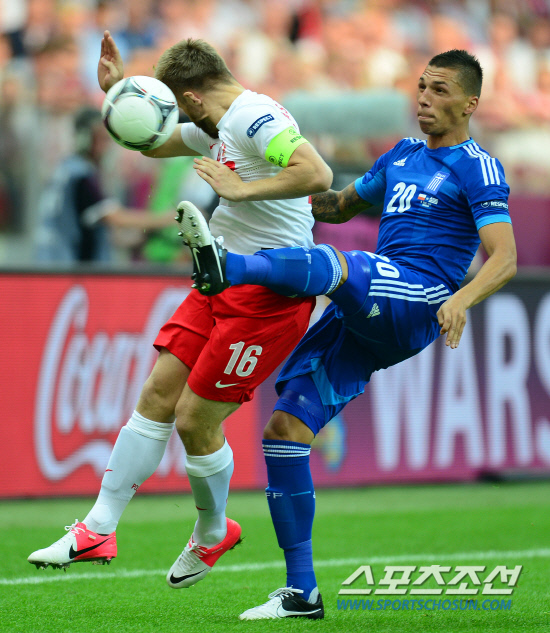 9일(한국시각) 폴란드 바르샤바 국립경기장에서 유로 2012 개막전 폴란드와 그리스의 경기가 열렸다. 그리스 홀레바스가 폴란드 브와시치코프스키의 두에서 발을 높이들어 공을 쳐내고 있다.