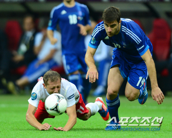 폴란드가 개막전에서 선제골을 넣고도 1대1 무승부에 그치고 말았다. 9일(한국시각) 폴란드 바르샤바 국립경기장에서 유로 2012 개막전 폴란드와 그리스의 경기가 열렸다. 폴란드는 전반 레반도프스키가 헤딩슛으로 선제골을 넣었지만 후반 그리스 살핑기디스에게 동점골을 허용했다. 그리스 파파스타 토풀로스가 폴란드 무라브스키의 뒤에서 태클을 걸어 넘어뜨리고 있다. 토풀로스는 이 반칙으로 경고를 받으며 2회 경고로 퇴장당했다.