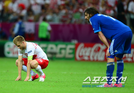 폴란드가 개막전에서 선제골을 넣고도 1대1 무승부에 그치고 말았다. 9일(한국시각) 폴란드 바르샤바 국립경기장에서 유로 2012 개막전 폴란드와 그리스의 경기가 열렸다. 폴란드는 전반 레반도프스키가 헤딩슛으로 선제골을 넣었지만 후반 그리스 살핑기디스에게 동점골을 허용했다. 무승부로 경기를 마친 양팀 선수들이 허탈해하고 있다.