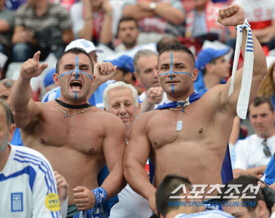 9일(한국시각) 폴란드 바르샤바 국립경기장에서 유로 2012 개막전 폴란드와 그리스의 경기가 열렸다. 우람한 근육질의 그리스 관중이 포즈를 취하고 있다.